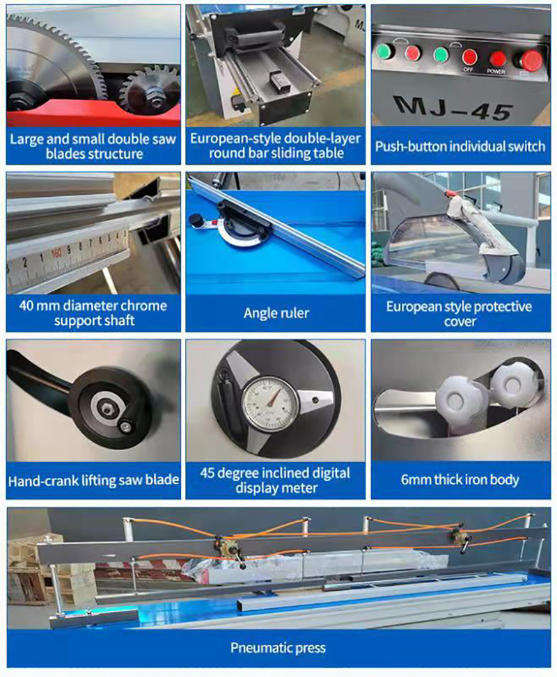 슬라이딩 목재 패널 톱은 절단 요구 사항을 충족하기 위해 다양한 표준 크기 옵션을 지원합니다. 이중 두꺼워진 둥근 막대 크롬 도금 가이드 레일, 높은 위치 정확도. 전기 리프트, 디지털 디스플레이 기능, 노동 절약, 작동 용이. 45도/90도 절단 패널 톱은 선택 사항이며 사용하기 쉽습니다. 밀도 보드, 파티클 보드, 목재 기반 보드, ABS 보드, PVC 보드, 플렉시 유리, 단단한 목재 및 기타 목재 구조물 및 유사한 경도를 가진 보드에 적합합니다.